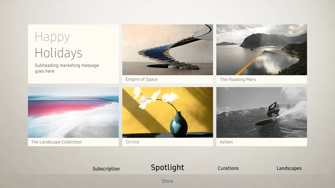The TV Art Store gives owners access to a curated library of additional art from international organizations, galleries, and museums. Since mobile purchasing wasn't supported in the development pipeline, the design guides users to complete their purchases on the TV itself.