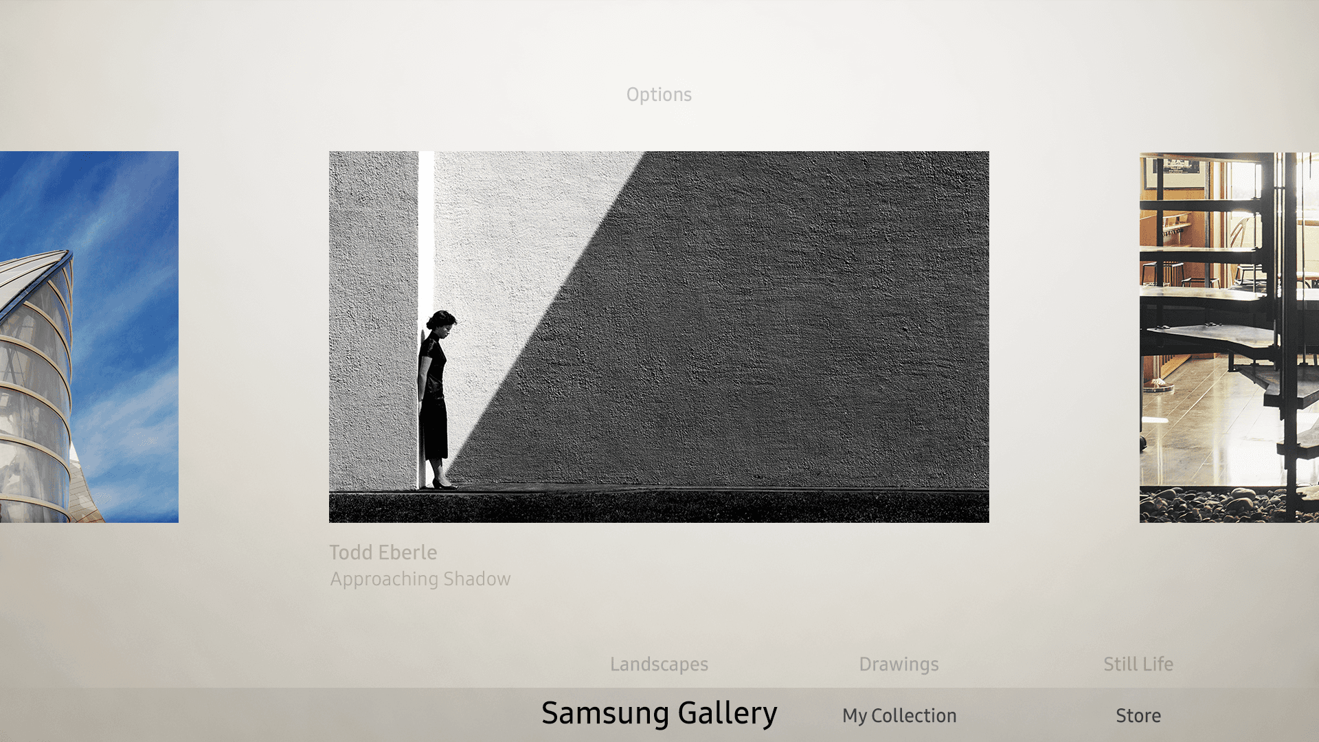 Users can browse curated artworks from Samsung Collection on TV using their remote, or relax while browsing artworks on the app. The features include a collection of professional digital art pieces across various genres and subjects, organized by category. Users can learn about each artwork's details as if they were in an art museum.
